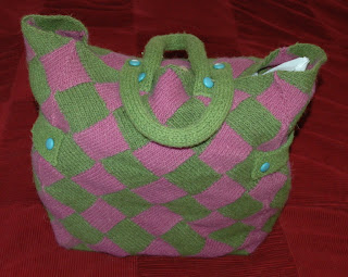 I knit the main bag in 5 seperate pieces. Two identical for front and back, and two for the sides, and one bottom. After each piece was done, I fulled the knitting using the same technique for hand felting....soaked it with hot water and rolled the heck out of it!!! I didn't push it to a complete felt stage, so all of the stitches are still visable, but it's extrememly tight and strong!!