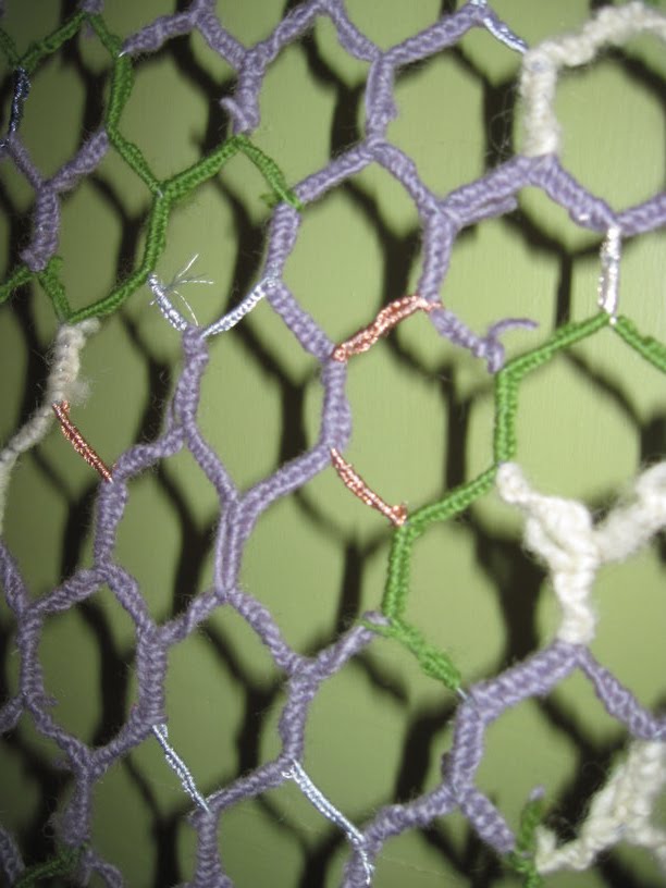 I found this awesome book on weaving from the early 70's that just turned me on! Since I was born under a 70's sun, I really wanted this piece to scream "retro", lol and I think I've been successful so far. This is a collection of bent coat hangers and old embroidery hoops and other rings that I worked seperately and then wired them all together. I'm using weaving and crochet and knitting. I'm also including techniques into the finishing that will give tribute to two of my favorite artists: Andy Goldworthy and Mandy Greer.